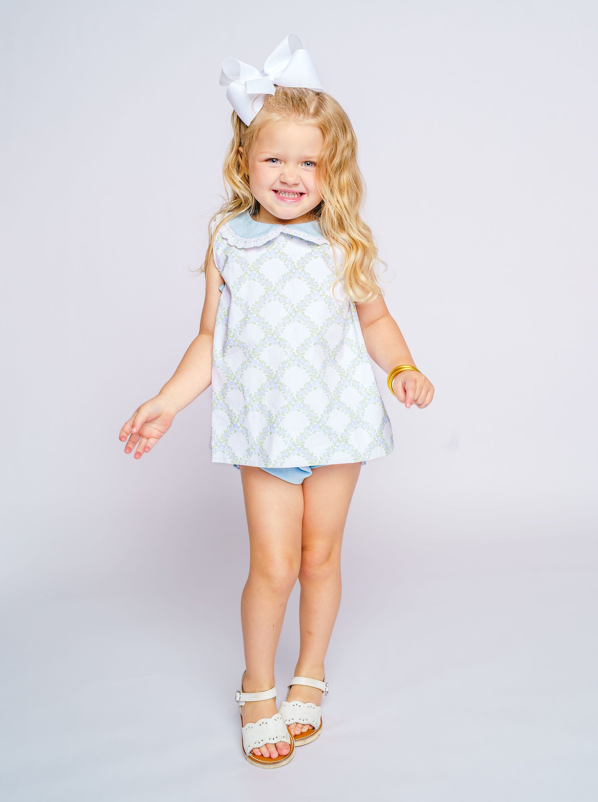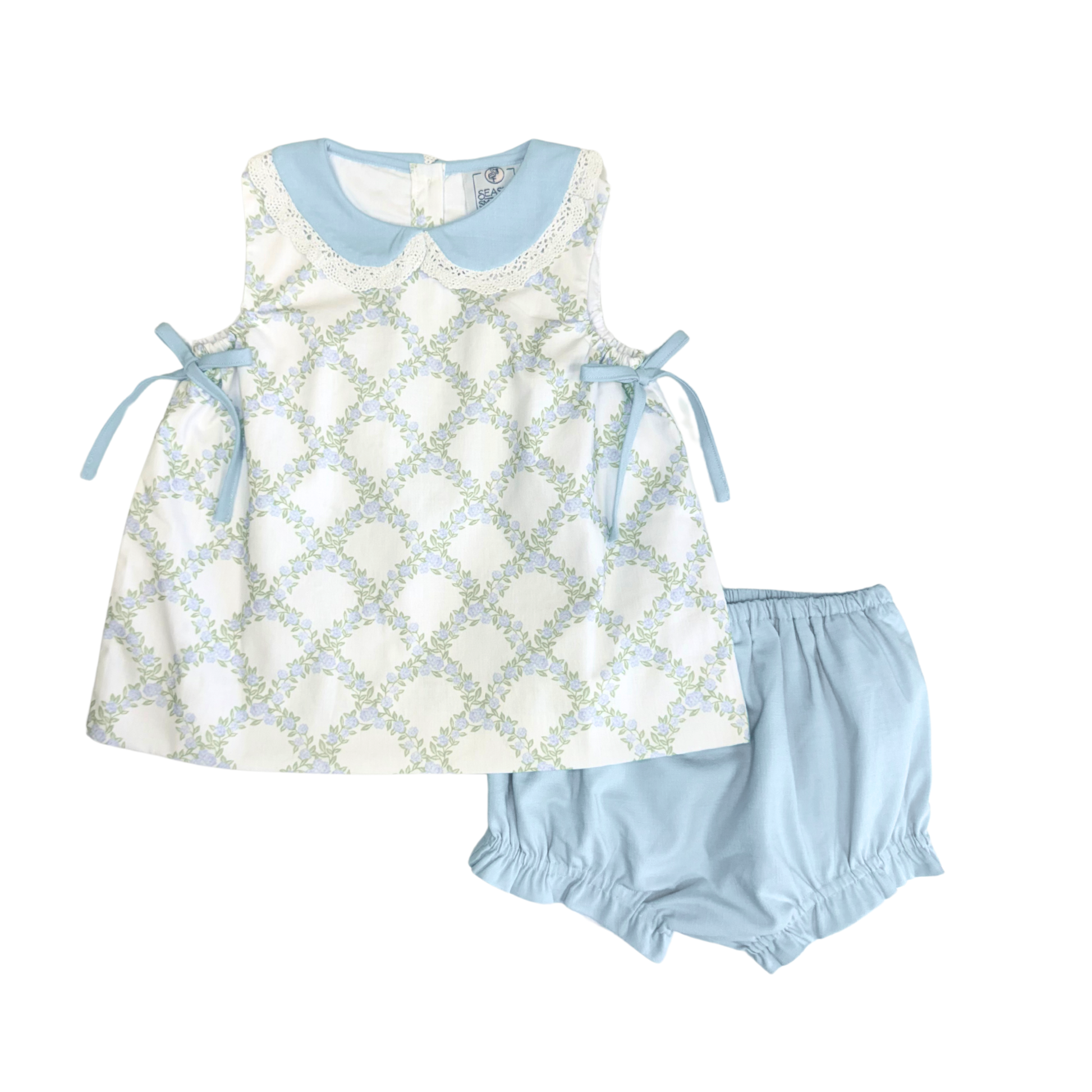 The Hydrangea Trellis Bloomer Set is full of timeless charm! The sweet top features a soft hydrangea trellis print in delicate hues, beautifully paired with a blue Peter Pan collar trimmed in dainty lace for a classic, feminine touch. Coordinating solid blue bloomers complement both the collar, and precious bows on the sides, bringing the whole look together with effortless style.