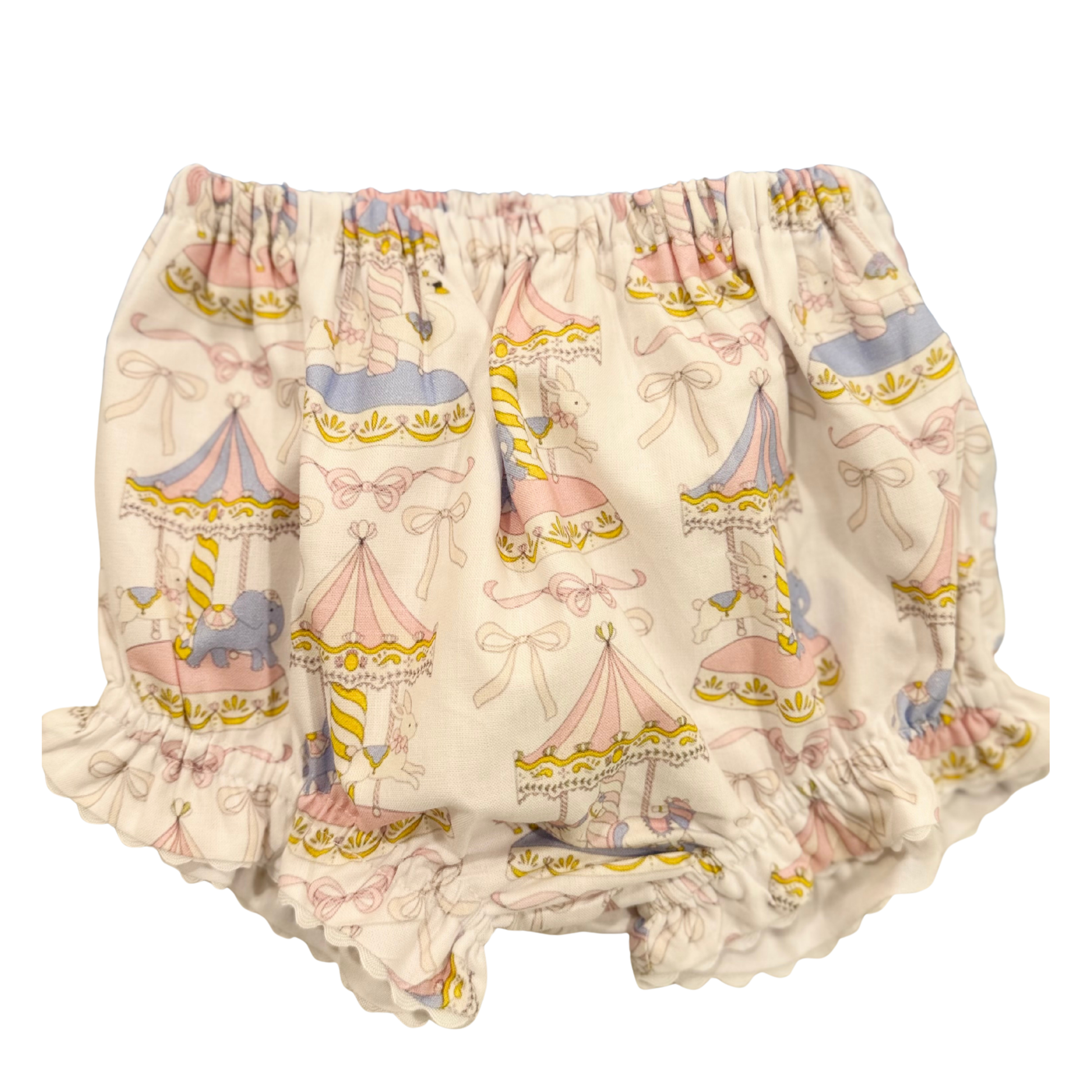 Our darling Lilly Carousel Ribbon Bloomer Set features a light blue polka dot top with a classic ribbon-style smocking detail, paired with whimsical carousel print bloomers. The perfect mix of playful and timeless, it’s made for twirling, tea parties, and everything in between.